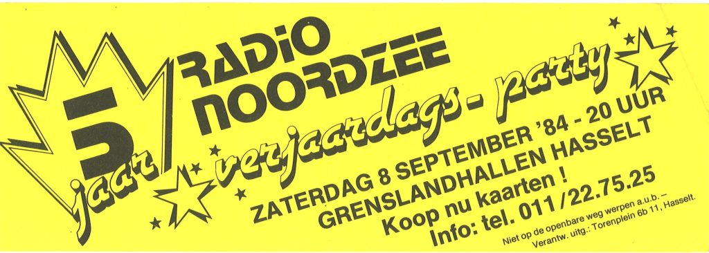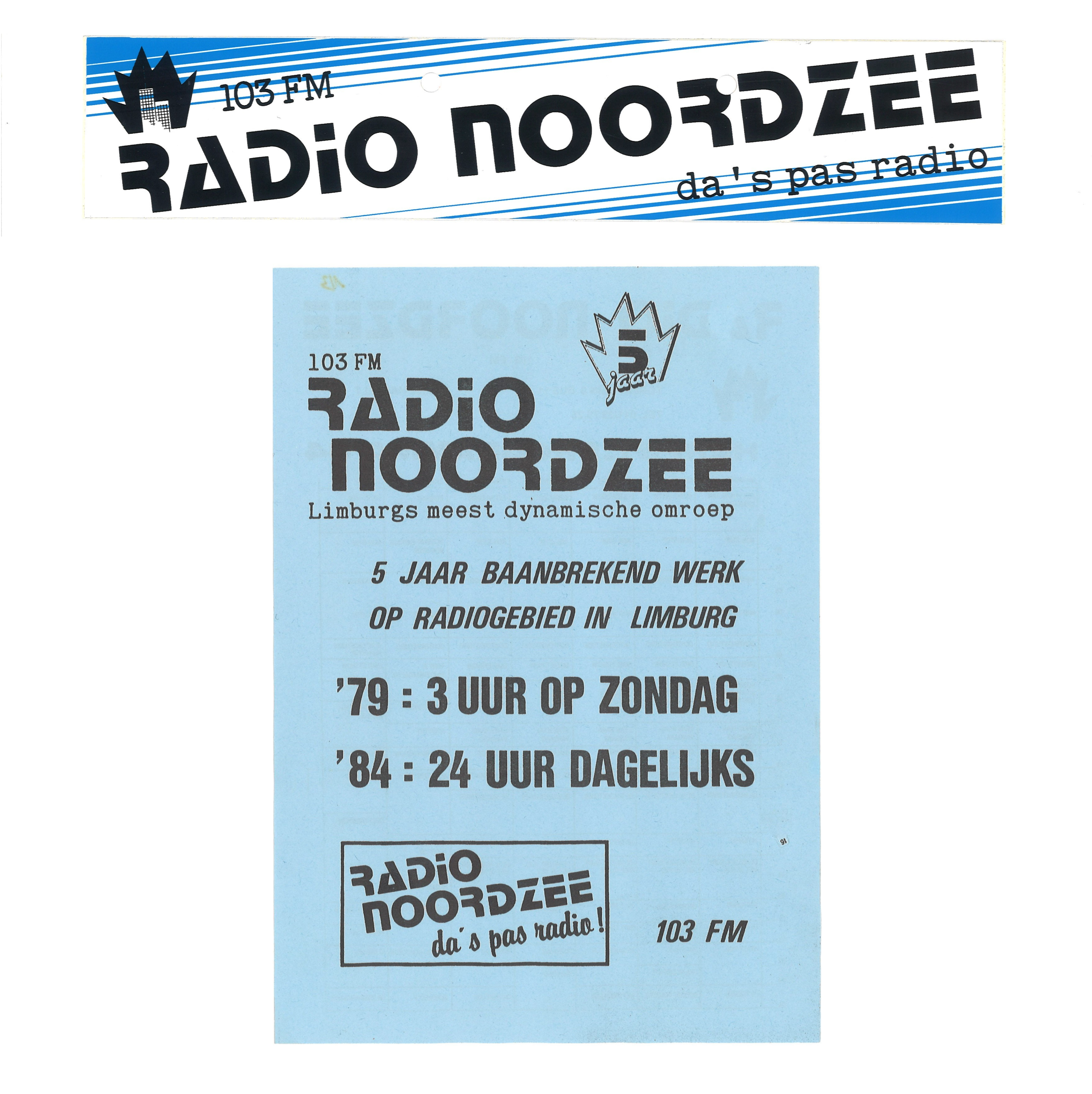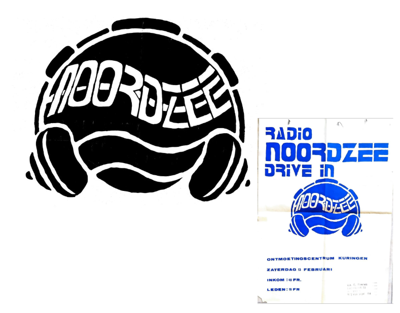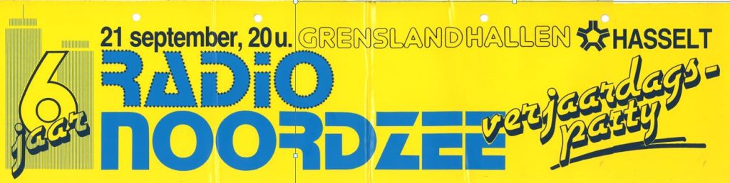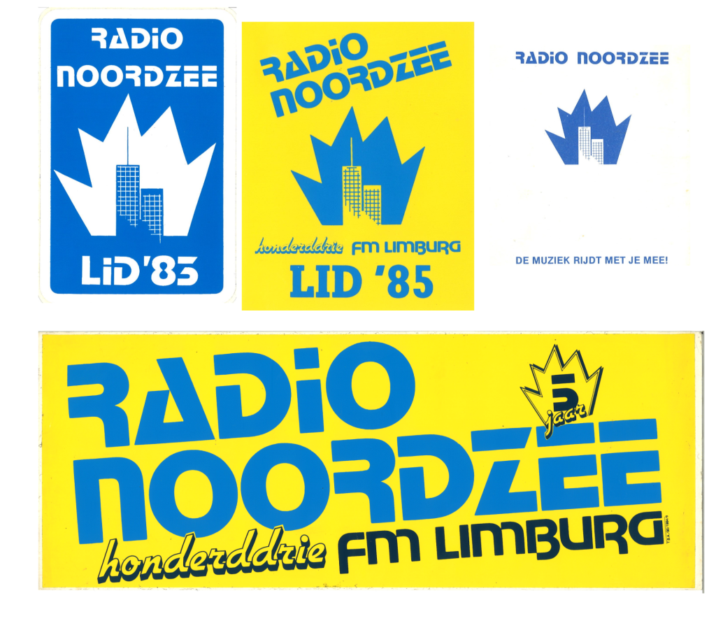 Hierboven enkele stickers met het torenlogo in een aantal variaties. Bemerk ook de toevoeging van ‘honderddrie FM Limburg’. Er waren midden jaren ’80 in Vlaanderen meerdere stations in de lucht die zich identificeerden als Radio Noordzee. Om het verschil duidelijk te maken werd zowel visueel als auditief de vermelding FM Limburg toegevoegd.